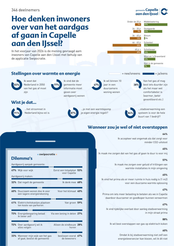 In het Warmteprogramma beschrijft de gemeente het beleid voor het aardgasvrij maken van alle gebouwen uiterlijk in 2050. Het warmteprogramma benoemt per buurt een voorkeursoplossing voor duurzame warmte. Ook komt er een planning met welke gebieden de gemeente aan de slag gaat in de periode 2026-2035. Voor het bepalen van de beste oplossing, stelt de gemeente een aantal criteria. Via de enquête Swipocratie vroegen we bewoners mee te denken over deze criteria en warmteoplossingen in hun buurt. De vragenlijst is ingevuld door 346 deelnemers.